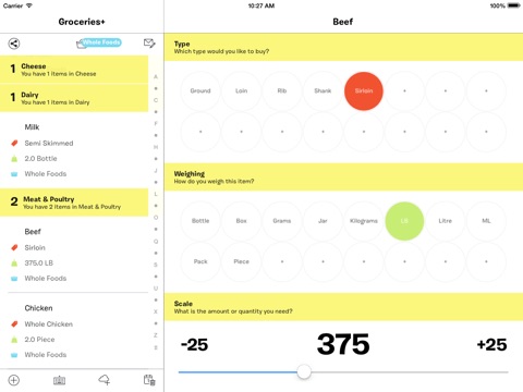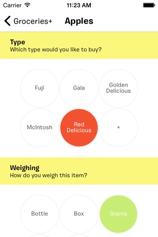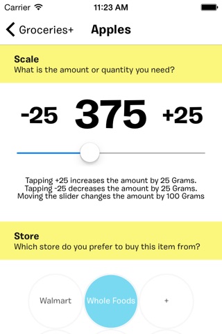 Just write or say a phrase like 250 g of Apples from Walmart and Groceries+ will list it for you (enable dictation in your iPhone keyboard if supported).