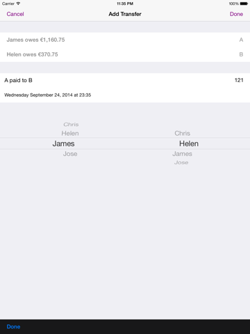 Who should pay next: Enter a future, evenly split, expense amount that needs to be paid. Then, calculate, for each member, which portion of that expense each member should pay. The app takes into account the past expenses and transfers, so that members who owe more to the group pay a higher portion of the future expense.