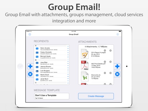 Use Group Email! to send emails to single contacts, to groups, to handpicked set of contacts or to distribution lists. You can optionally attach photos, videos, documents, locations information with map and address, audio clips, pasteboard content and contacts information (vCard or text).