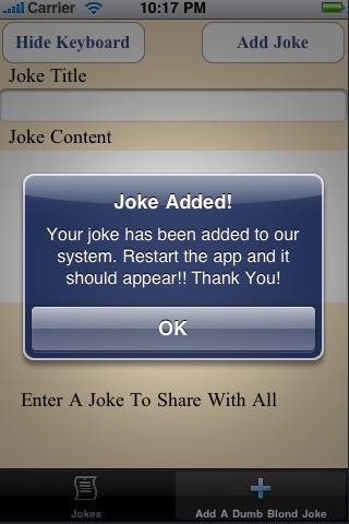 Easily Add and Share Dumb Blonde Jokes with other app users.