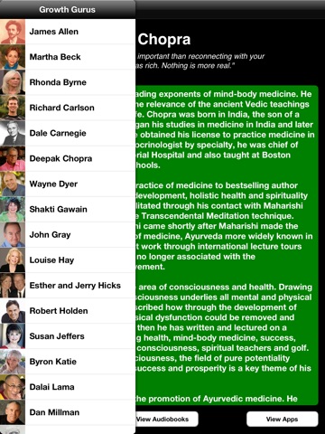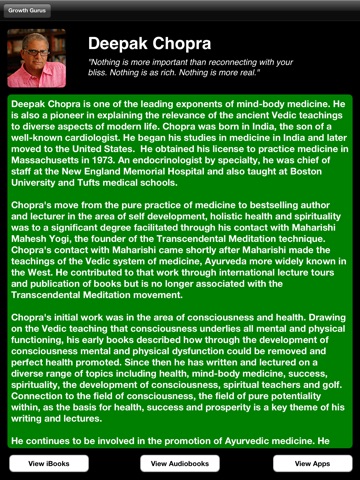 INSTRUCTIONS: Click on the name of the guru in the list to access information about that guru. Select the iBooks, Audiobooks or Apps button to be taken directly to the iTunes catalogue for the guru. To return to the app, double click the home button and select the Growth Gurus icon.