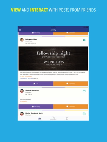 Participate in conversations, share ideas, posts, events, event check-in, make payments for dues and registrations, donations to your church or organization, view contacts, and more.