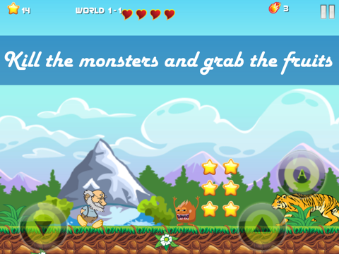 Grab tasty fruits along the way but be careful about the traps and monsters on the way. There are some funny and some dangerous monsters which are going to attack your crazy grumpy grandpa. You can either avoid or kill those monsters with fireballs.