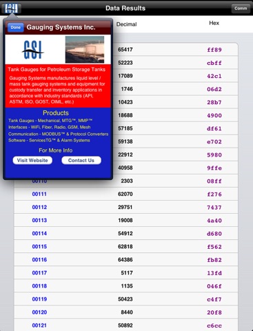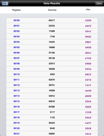 When you exit the Comm page, the main tabular page will show the Modbus registers that were polled and their data in both decimal and hexadecimal format.