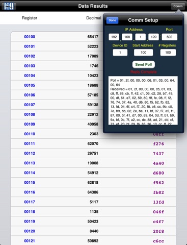 Just tap the Comm button for the communication setup page to enter the communication parameters for your device and send it a Modbus-TCP poll.