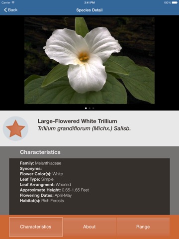 Version 2.0 of the application currently covers 178 of the most commonly observed wildflower species within the Great Smoky Mountains of Tennessee and North Carolina. The current focus of the project is primarily herbaceous plants, although some sub-shrub and woody vines have been included. These species are represented by over 500 images and detailed descriptions that include information regarding plant characteristics such as: approximate height, flower color, leaf type, leaf arrangement, leaf size and margins, inflorescence types, flower attributes, flowering period, and habitats.