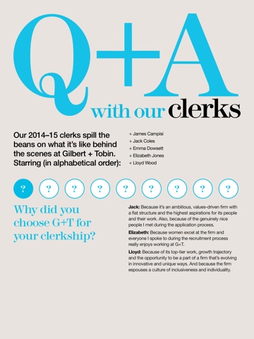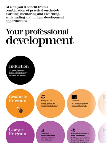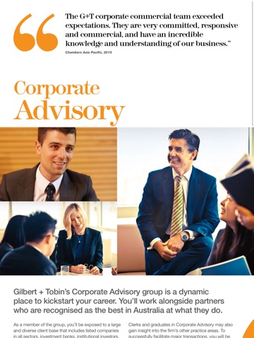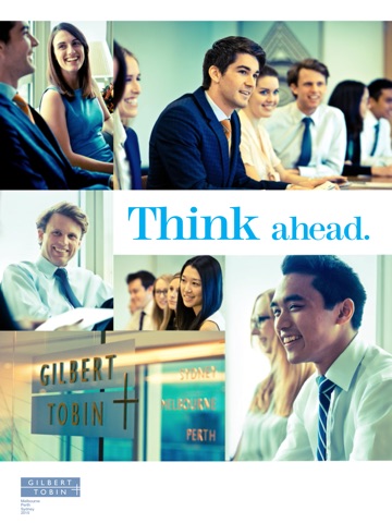 Are you considering applying for a position at Gilbert + Tobin? G+T Careers is a free app designed to provide candidates with an introduction to working at Gilbert + Tobin. The app is for law students and lawyers and includes details of what it’s like to be part of the Gilbert + Tobin team. The app also delivers specific information about our clerkship programs and recruitment opportunities across our offices in Melbourne, Perth and Sydney. Think Ahead and make the smart career choice by downloading our app today.