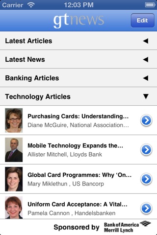 Stay up to date with the latest treasury and finance thought leadership, news, and credit rating changes from around the world with gtnews for iPhone, sponsored by Bank of America Merrill Lynch. Updated constantly, gtnews for iPhone allows you to customise gtnews to the sections you want to read, with the full content of the website available wherever you are. Wifi or 3G required to download articles which are then also available offline.
