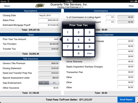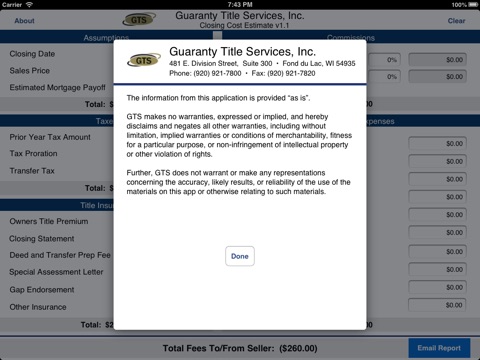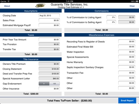 This application is designed to help provide a rough estimate of closing costs that you will incur when doing a closing or title insurance with Guaranty Closing & Title Services, Inc. It calculates the estimated amount of taxes you will owe as well as fees that will be paid to agents.