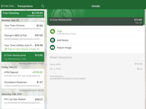 Add Tags, Notes, Images & Geo-Information: By enhancing transactions with custom tags, notes or photos of a receipt or check, you have the ability to stay organized and find exactly what you’re looking for when searching through your finances.