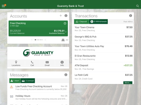 To use the Guaranty Mobile Access App, you must be enrolled as an Guaranty Bank and Trust Internet Banking user. If you currently use our Internet Banking, simply download the app, launch it, and login with the same Internet Banking credentials. After you successfully login to the app, your accounts and transactions will begin updating.