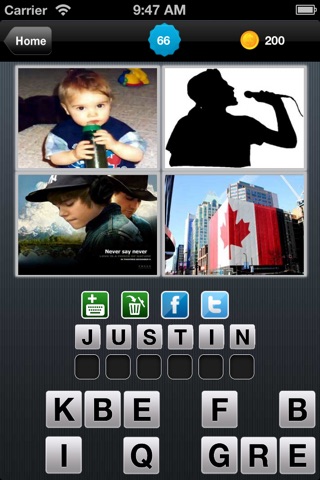 Similarly, 4 pics of Justin Bieber will show Canadian Flag, Never say Never (his popular song), Singer and his childhood picture.