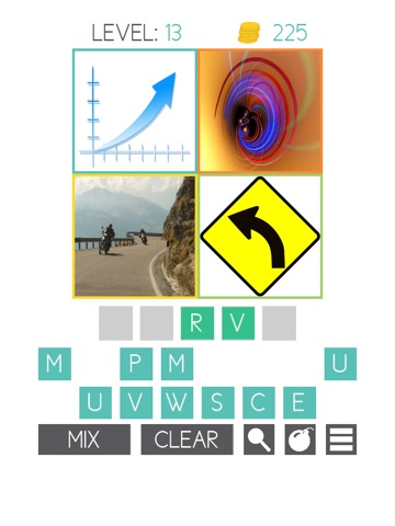 Each puzzle consists of 4 pictures and a mystery word which you must guess. The mystery words letters are scrambled in with other letters for a total of 16 letters to choose from. The 4 pictures attempt to illustrate the mystery word to you.