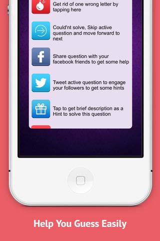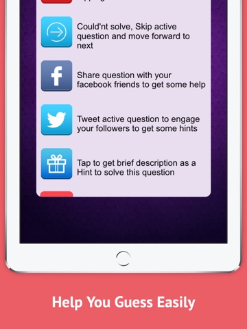 Facebook, Tap f icon to post active question on your time line to ask your friends or fans helping you guess correct answer.