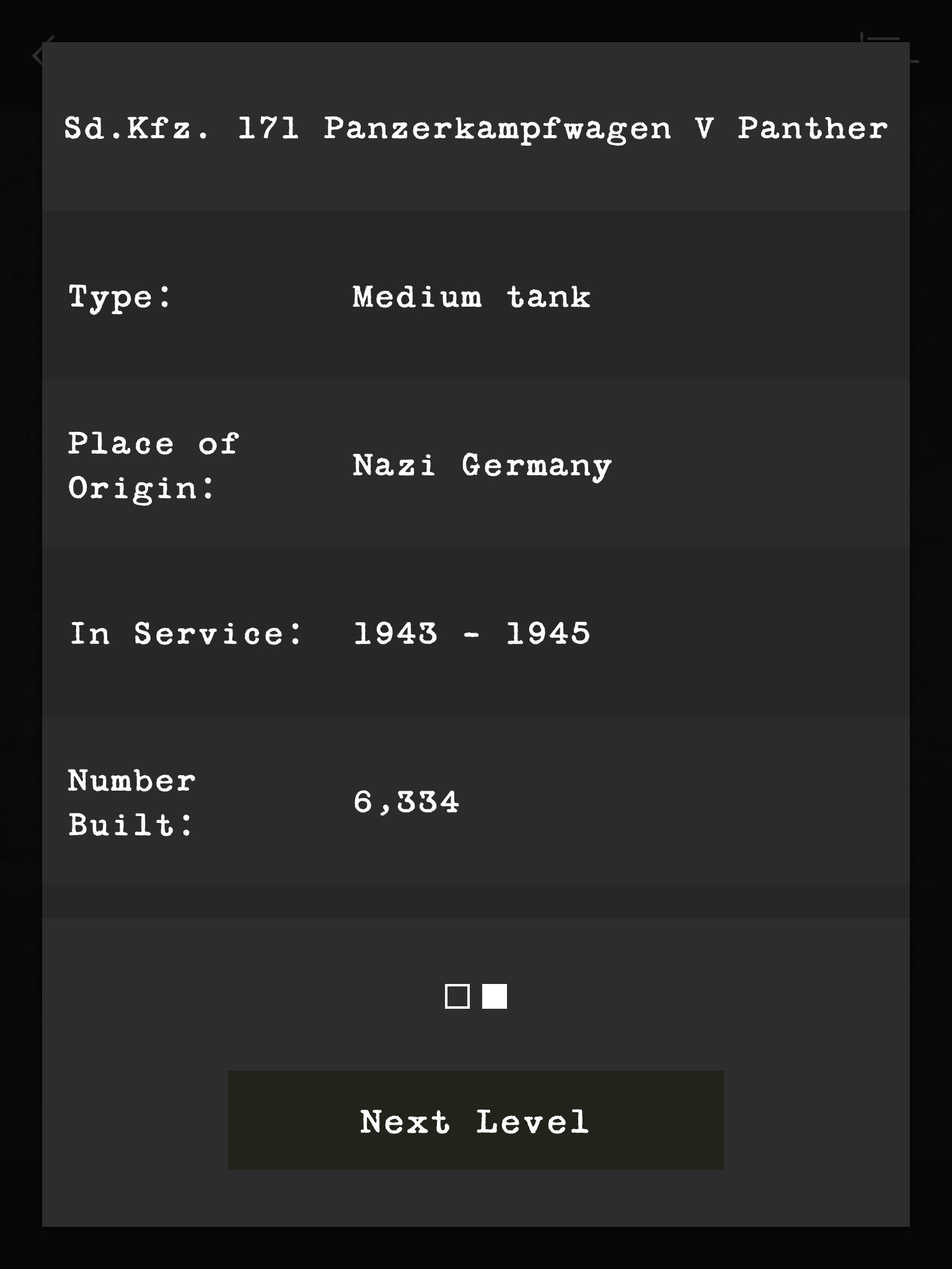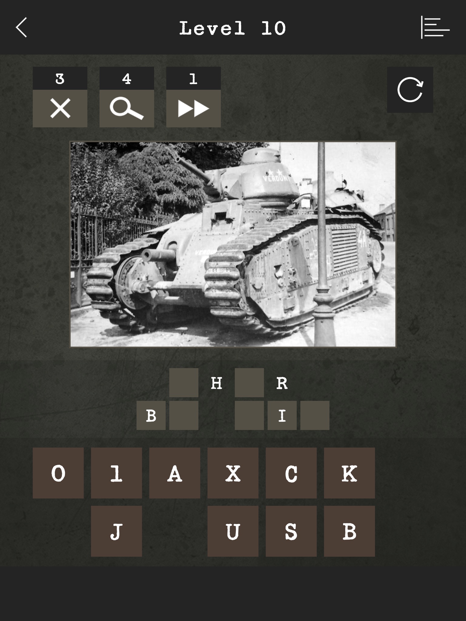 Je trouve ce jeu très intéressant et surtout très instructif (car une fois le char trouvé, on a un descriptif complet de celui ci.) Petit problème, les chars a trouver sons souvent les mêmes et des fois, on doit trouver 2 dois le même a la suite. En conclusion: + : un jeu bien complet et intéressant - : manque des chars connus (M8 par exemple) et mauvais placement des chars a trouver.