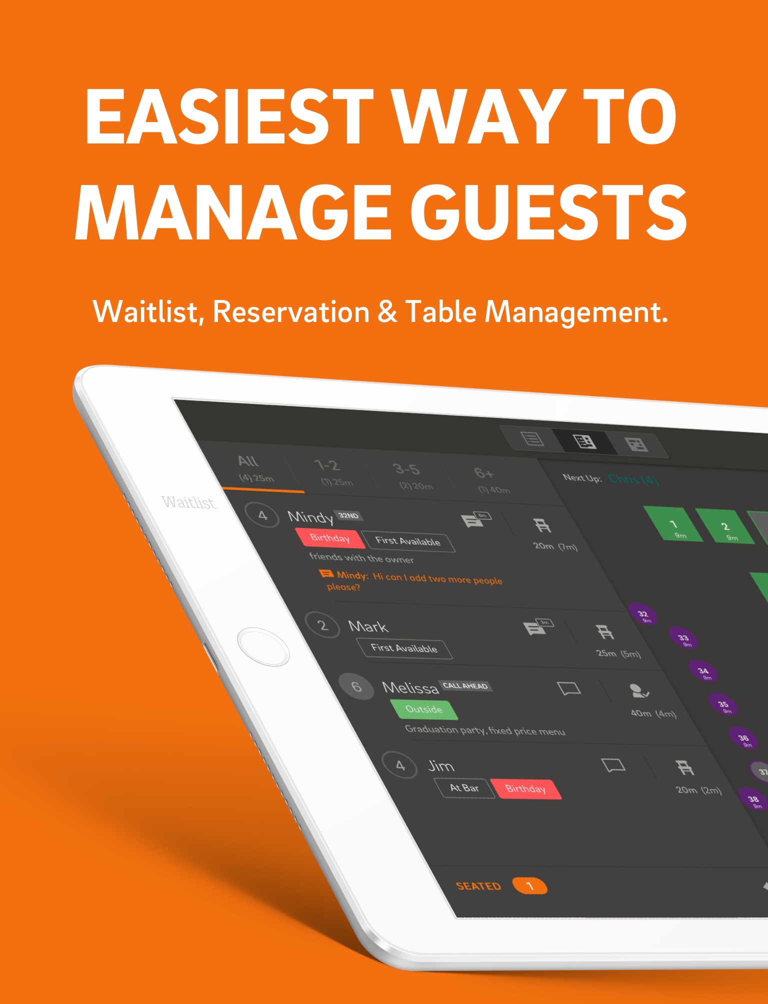 • Manage walk-ins, reservations, and call-ahead parties.