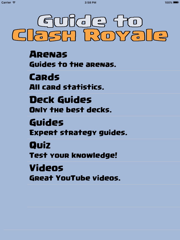This app is not affiliated with Clash Royale or endorsed, sponsored or approved by SuperCell. This app acts as guide for players and gives them a better understanding of the game.