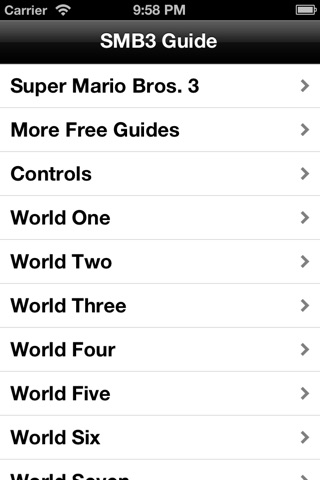 This is a complete walkthrough guide of the video game Super Mario Bros. 3. Use it to find your way through the entire game. Carry your iPhone or iPod Touch with you while you play, and pop it out of your pocket and open the guide when you get stuck. A great companion app.
