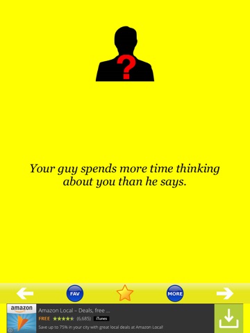 I do like this app. My fiancé can tell me this stuff himself, but its hard 2 know if hes actually telling the truth or if hes just telling me what I want 2 hear, but 2 have this app that doesnt know me @ all & has nothing 2 gain or lose from telling it like it is is something Ill listen 2 & believe. All Id like is 2 be able 2 expand on certain statements & get more in-depth explanations, reasons, & or examples of what a guy wants versus a brief one sentence statement. Overall, it is really insightful 2 know how or what makes the majority of guys "tick".
