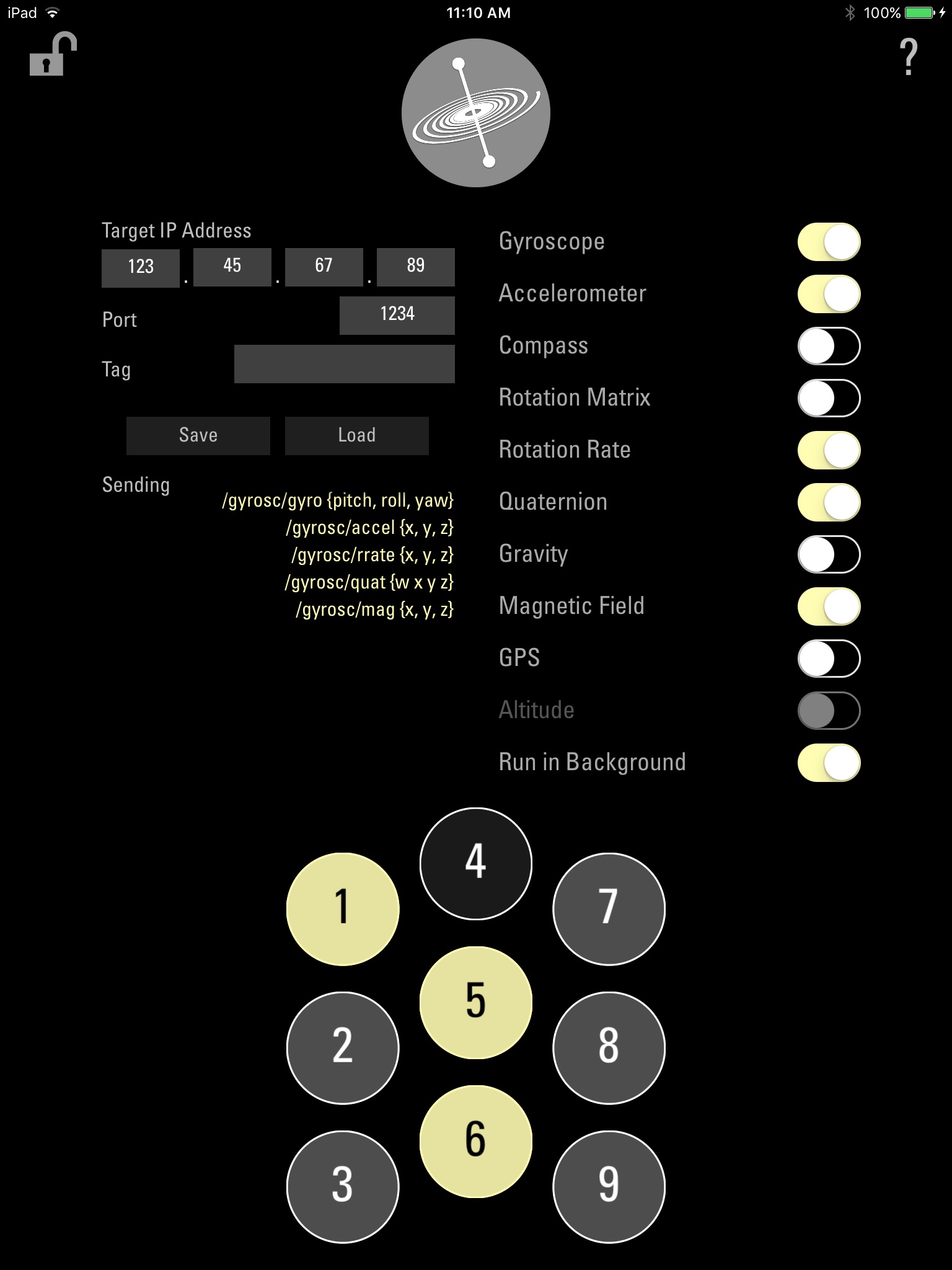I use this app to collect the gyro datas on puredata, its perfect !