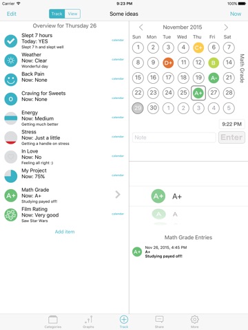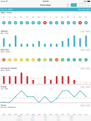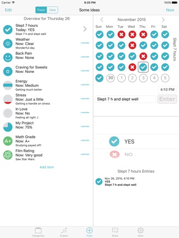 Very good application to follow our habits using marks or texts. In my case I have created some lists like "drink alcohol", "headache", "exercise" (all using marks) and one list for foods (using texts). My objective is to understand if my headaches have some relation with food, alcohol or the lack of exercises. Using this software this task became very ease, fast and pleasant.