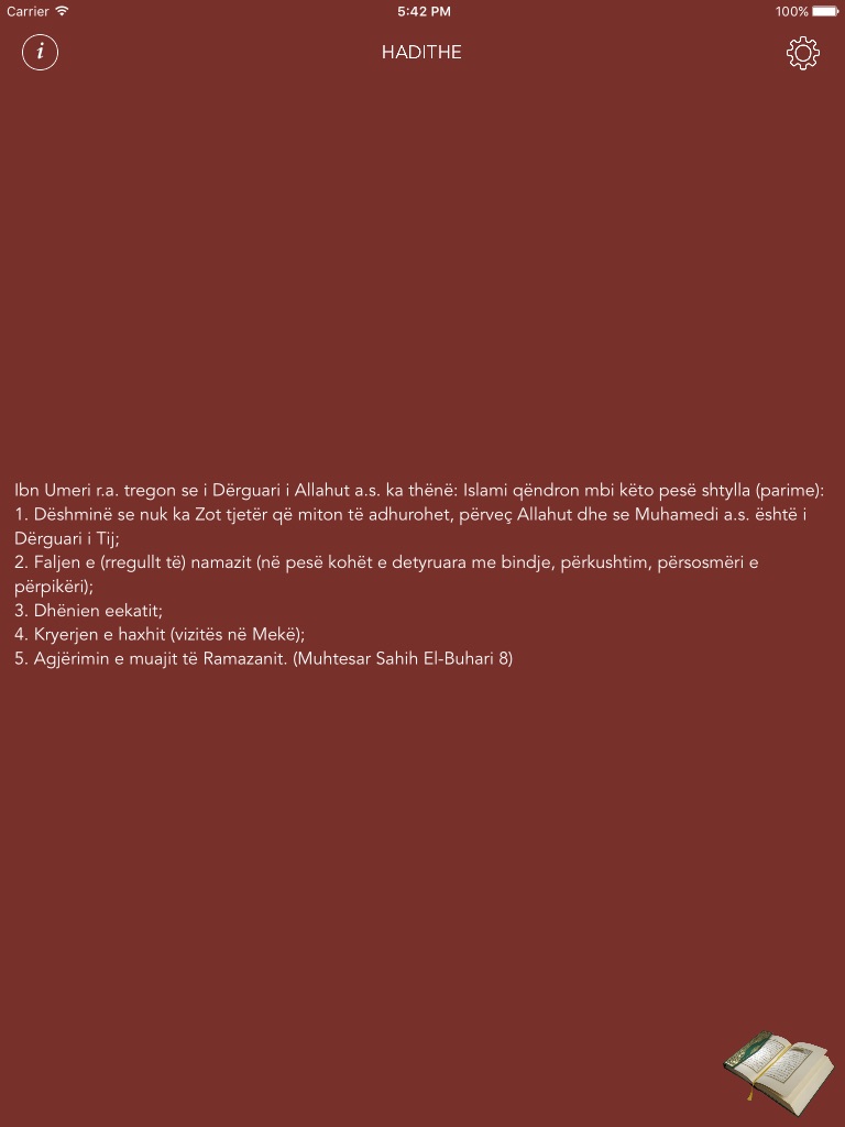 Ne kete aplikacion mund te lexoni hadithe te zgjedhura te Pejgamberit te Allahut Muhammedit alejhi selam. Hadithet jane marre nga permbledhja e librit "Sahih el-Buhari"