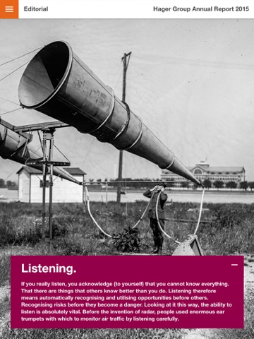 For this reason, Hager Group has dedicated its Annual Report 2015 to the all-important art of listening. Among other things, it describes how experts from politics, economics and society have come together to discuss technologies that make daily life considerably easier for the elderly and those in need of care. It documents a successful attempt by Hager Group’s customers, developers and technicians to develop an operating system for a hotel that can be understood intuitively around the globe. It also includes a contribution from renowned architect Matthias Sauerbruch, who talks about his experiences with building technology and its applications. “We have to get the users involved,” he recommends. “Even the best technology will only work if users are prepared to engage with it.”