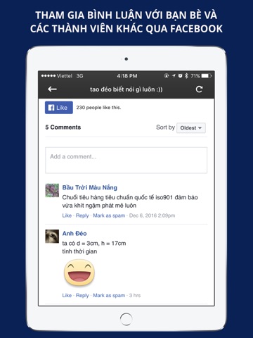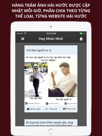 This application collection all funny pictures and comic from many famous sharing Website in Vietnam (haivl.com , epic.vn , aenhavip.vn ). It have nice interface and a lot of features to help user. With a genius filter , the comics is updated every minute.