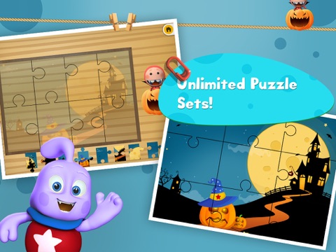 Interactive halloween theme puzzle game for kids and toddlers to improve their motor and cognitive skills by joining the small pieces of puzzles into bigger halloween scenes.