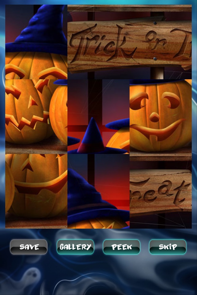 Enjoy of high quality images. The game contains 60 levels with beautiful pictures with ghosts, spiders, witches, pumpkins and more. Drag the pieces to the right place to create the image. Use "Peek" button to preview the original image. Completed levels will be unlocked and you can save images to your phone photo gallery. If you can not complete any level you can simple skip it and try to complete it later. Just press "Skip" level button to skip current level.