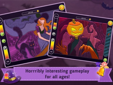Halloween Patchwork Trick or Treat has puzzles made of 6 different materials: wood, cloth, glass, paper, precious stones and metal. Piece together patchwork-style puzzles and guess the picture: Halloween characters, a haunted house, a monster in the bed, ghostly shadows, a sinister castle, a black cat, a Jack-o-lantern, a headless horseman, zombies, vampires, witches, pumpkins and other nightmares. Boo! Dont be afraid, the ghosts riddles arent scary at all, but terrribly fun!