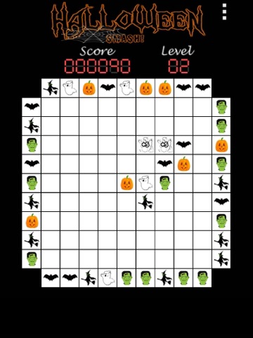 Halloween Smash! is a fun Halloween themed version of Ball Smash!. Its an addictive, progressively difficult, and fun puzzle game. The objective is to clear all of the objects from the inside of the grid using the matching objects on the sides. Tapping objects on the sides of the grid will move them horizontally and vertically towards the objects in the center. Adjacent, matching objects are eliminated and points are earned for the objects that are removed. Bonus points are given for more than 2 objects being eliminated at the same time. Clear the entire grid to progress to the next level. Levels increase difficulty with additional objects and more possible points.