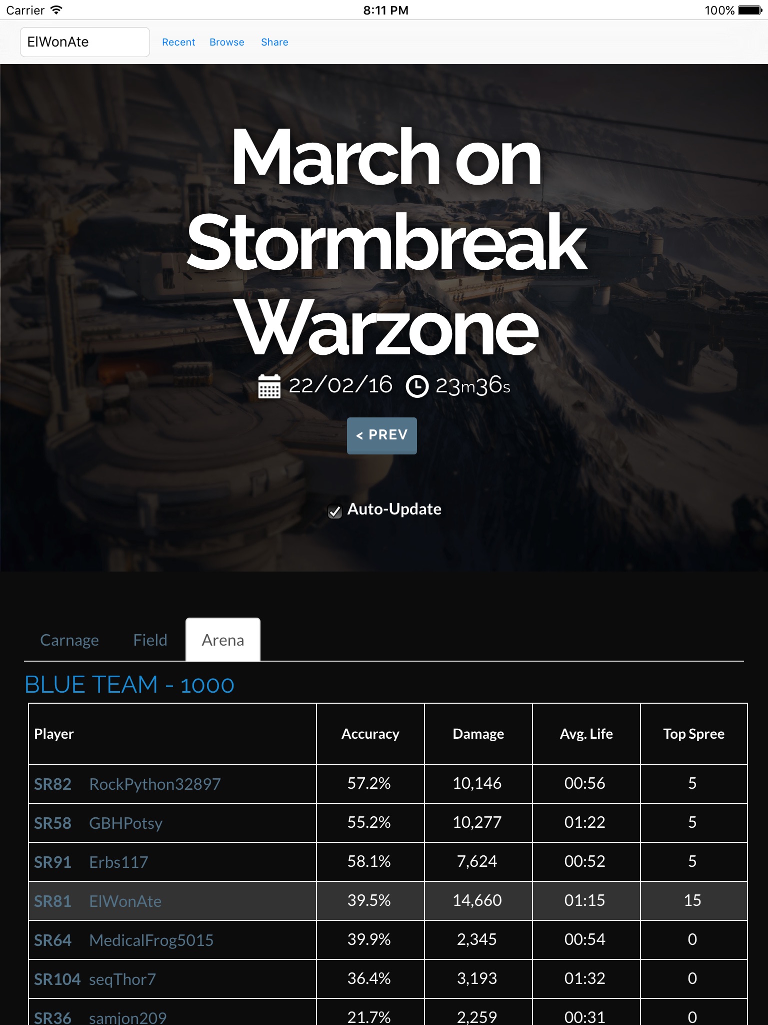 An extended Carnage Report for Halo 5! This app automatically updates to show your latest Arena, Warzone or Custom Game Carnage Report when your Halo 5 game finishes. This shows in-game statistics (Score, Field Stats, Average Time Alive, Accuracy, KDA, Top Spree etc.), rank progression, tools of destruction, medals and kill information.