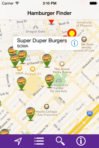 Pins are customized to identify the common hamburger establishments.