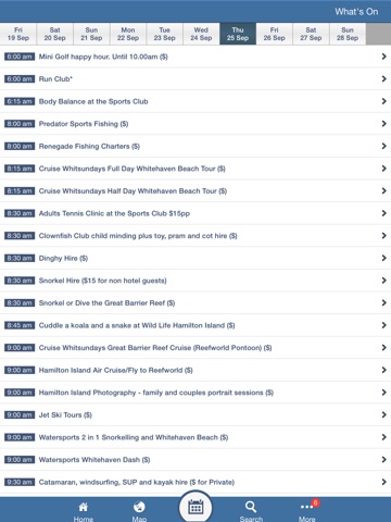 - Detailed listings of all the facilities, activities, and services offered to guests on Hamilton Island, with prompts on how to book, and when they are next scheduled