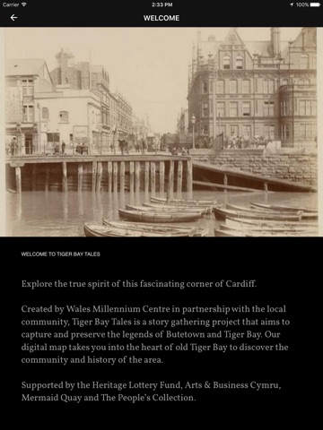 Created by Wales Millennium Centre in partnership with the local community, Tiger Bay Tales is an app that aims to capture and preserve the legends of Butetown and Tiger Bay. Our digital map and 360 panorama images takes you into the heart of old Tiger Bay to discover the community and history of the area.
