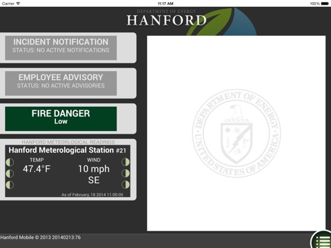 The Hanford.gov Mobile app brings you Hanford Incident notifications, Employee Advisory notifications, Fire Danger information, Red Flag warnings, Hanford Weather Station information and Hanford Employee lookup.