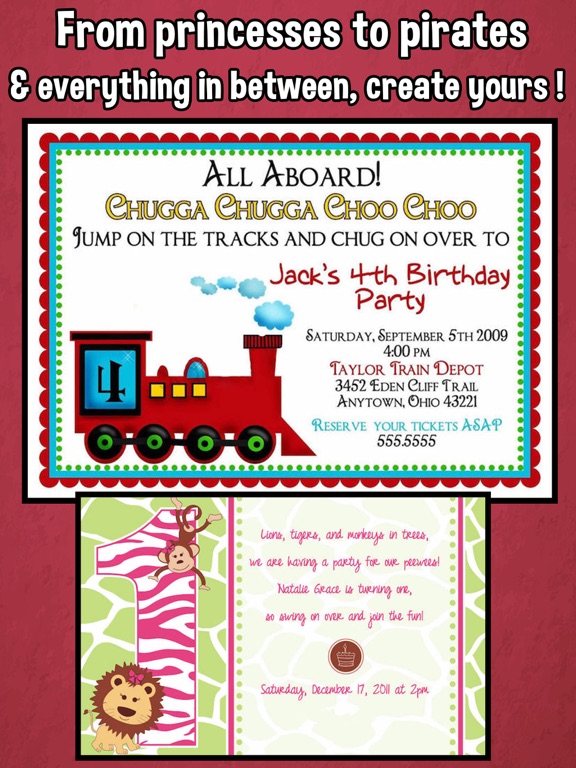 Festive kids birthday invitations for boys and girls. Invite as many children as you want to a birthday party with virtually any theme or design you can think of.