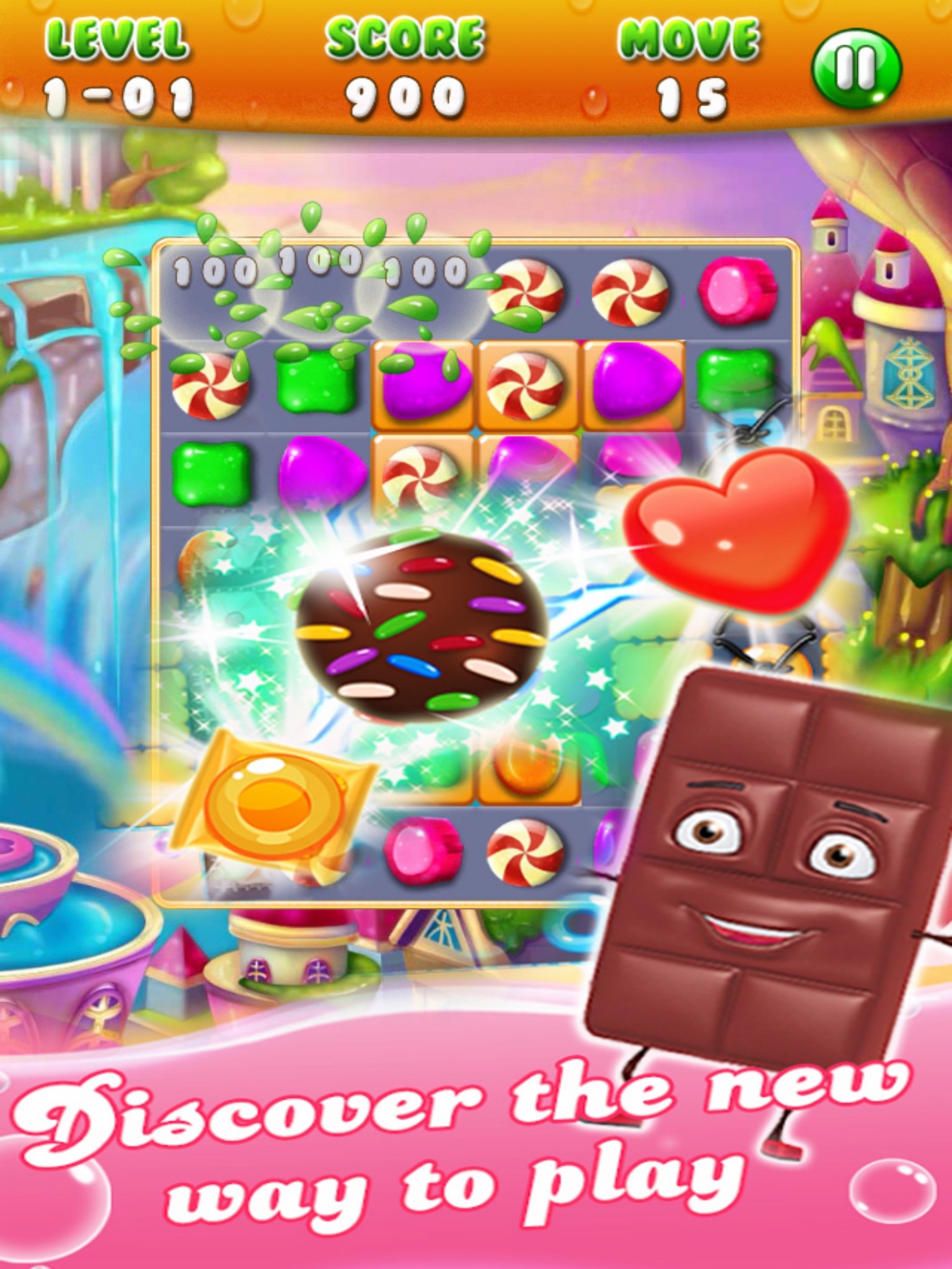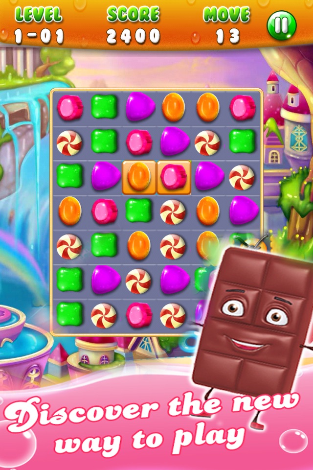 Objectives differ in over 100 levels. Make matches of 3 or more candies, create candy blasts! Starts out simple, but things get more and more interesting and challenging.