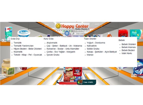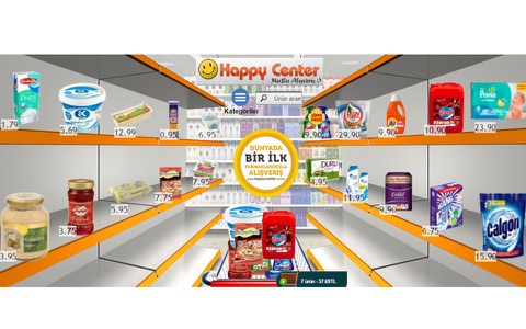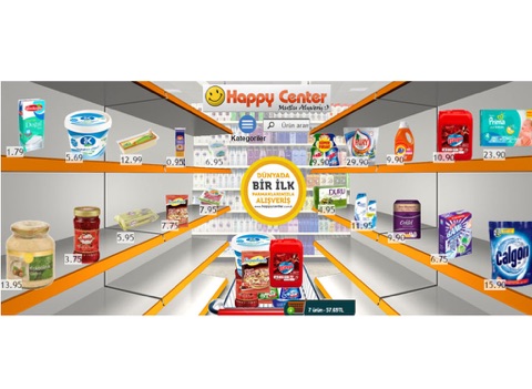 Konumunuza en yakın Happy Center marketlerinden tek tuşla meyve, sebze ve market alışverişi yapabilirsiniz. Dünyada ilk ve tek 3 boyutlu raf sistemi ile sadece parmaklarınızı kullanarak evinizden ya da işyerinizden kalkmadan market alışverişinizi kapınıza kadar getirtebilirsiniz.
