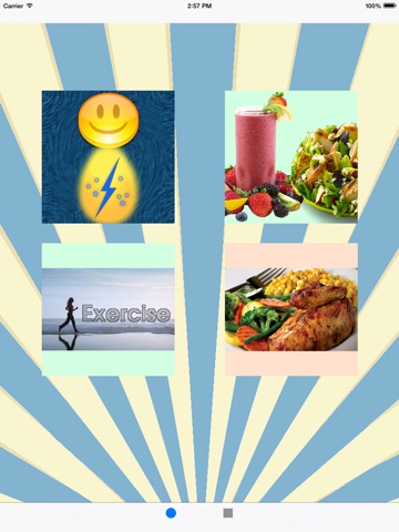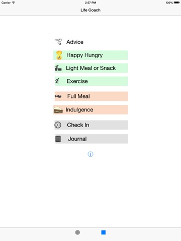 * the main screen accepts a simple tap to record one of 4 things going on: feeling hungry, eating a light meal or healthy snack, exercising, or eating a full meal.