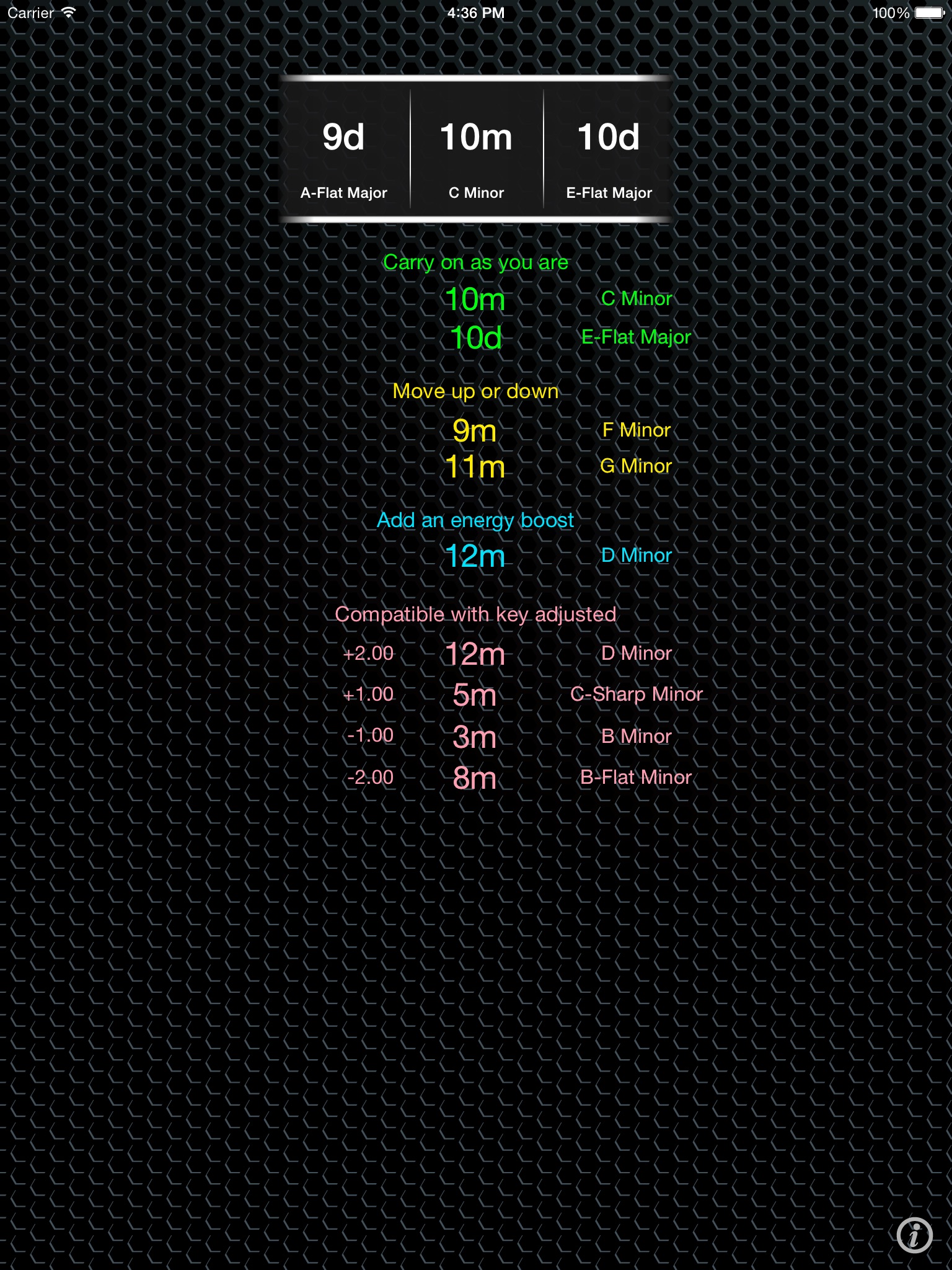 Harmonic mixing (also called key mixing) is very popular technique to help DJs smoothly mix between songs which are in musical keys that work really well with each other. There are various approaches but the most popular is using the OpenKey and Camelot wheels. This app is based on this same approach as the wheels, but it takes it a step further and gives you even more options as you mix. If youve never tried it, it sounds a bit far fetched at first, but its amazing how well it works and if you delve into the underlying musical theory it all makes perfect sense. As well as the typical move 1 place round the wheel options, it also gives you the well known two semitone energy boost key option plus 4 additional keys you also can use if your DJ software lets you tweak a tracks key as it plays. All without a wheel and the complex jumping tables in sight!