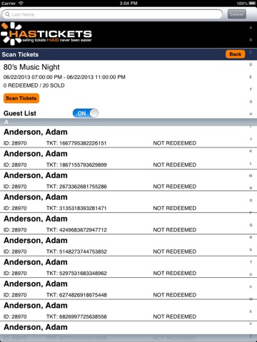 The Has Admin app was developed for use by Has Tickets clients. The app can be used to scan bar-coded tickets directly from your iOS device, or manually check customers in using the built-in interactive guest list feature. This app will streamline the process at the door of your event and will eliminate the need for larger scanning stations. Both cellular and Wi-Fi signals can be used.