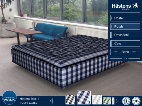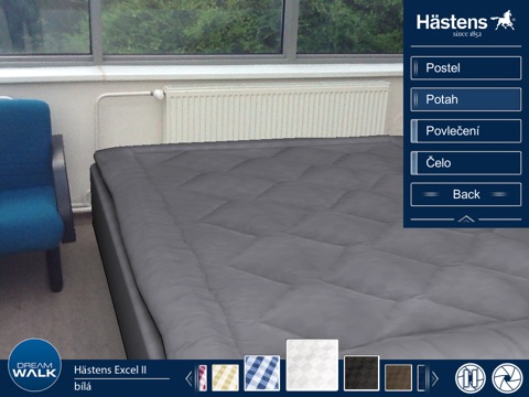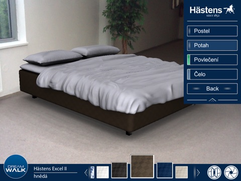 V pohodlí domova si můžete vyzkoušet jak bude nová postel značky Hästens vypadat přímo ve Vaší ložnici. Umístit ji do prostoru, v interaktivním prostředí si ji rotovat a přibližovat. Dále si nadefinovat typ postele, barvu potahu, povlečení, čelo …. Projít aktuálním katalogem společnosti atd.. Na závěr pořídit snímek do galerie a ten třeba použít i jako přílohu k objednávce."