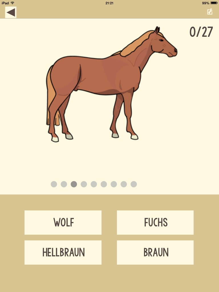 Leider in unter 10 Minuten damit durch. Auch nicht für Anfänger geeignet ➡️ eventuell Erklärungen mit reinpacken. Auch sind einige Fehler drin. So lautet die "richtige" Antwort an einer Stelle Black und die korrekte Bezeichnung des Falben fehlt auch als Antwortmöglichkeit.