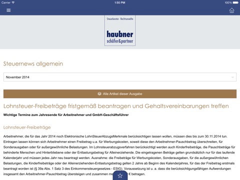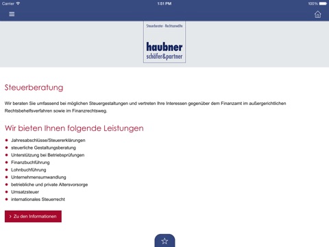 Mit unserer App für iPhone, iPad und iPod touch wollen wir Ihnen die absolute Mobilität bieten. Nach dem Download unserer App stehen Ihnen umfangreiche Informationen und unsere praktischen Onlinerechner auch mobil zur Verfügung. Wir halten Sie über Neuheiten aus unserer Kanzlei und über Steuernews auf dem Laufenden.