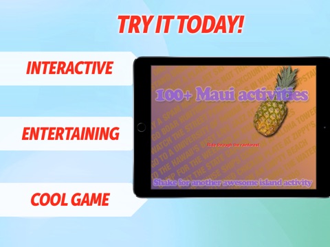With Hawaii Activities--100+ Awesome Things on Maui, everything for a perfect Maui vacation is available right at your fingertips. Love tanning on the beach? Great! Prefer hiking through a lush rainforest? Sure! Or maybe you rather witness Hawaii on horseback? We got you covered! Just shake or click the screen to activate the fun-filled activity generator.