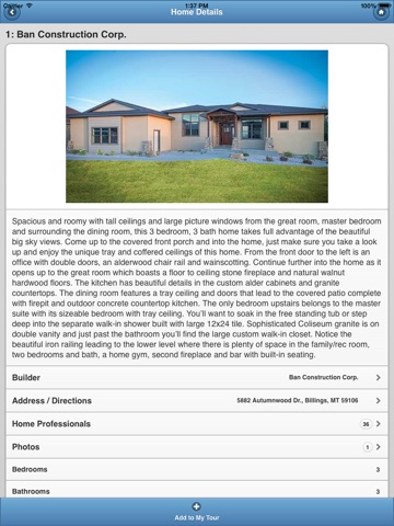 Attending the Billings Parade of Homes has never been more simple. Just download this app, and enjoy the tour. This app allows you to navigate from home to home using onscreen GPS, see photos and details of each home, have quick access to builder contact information, and much more!