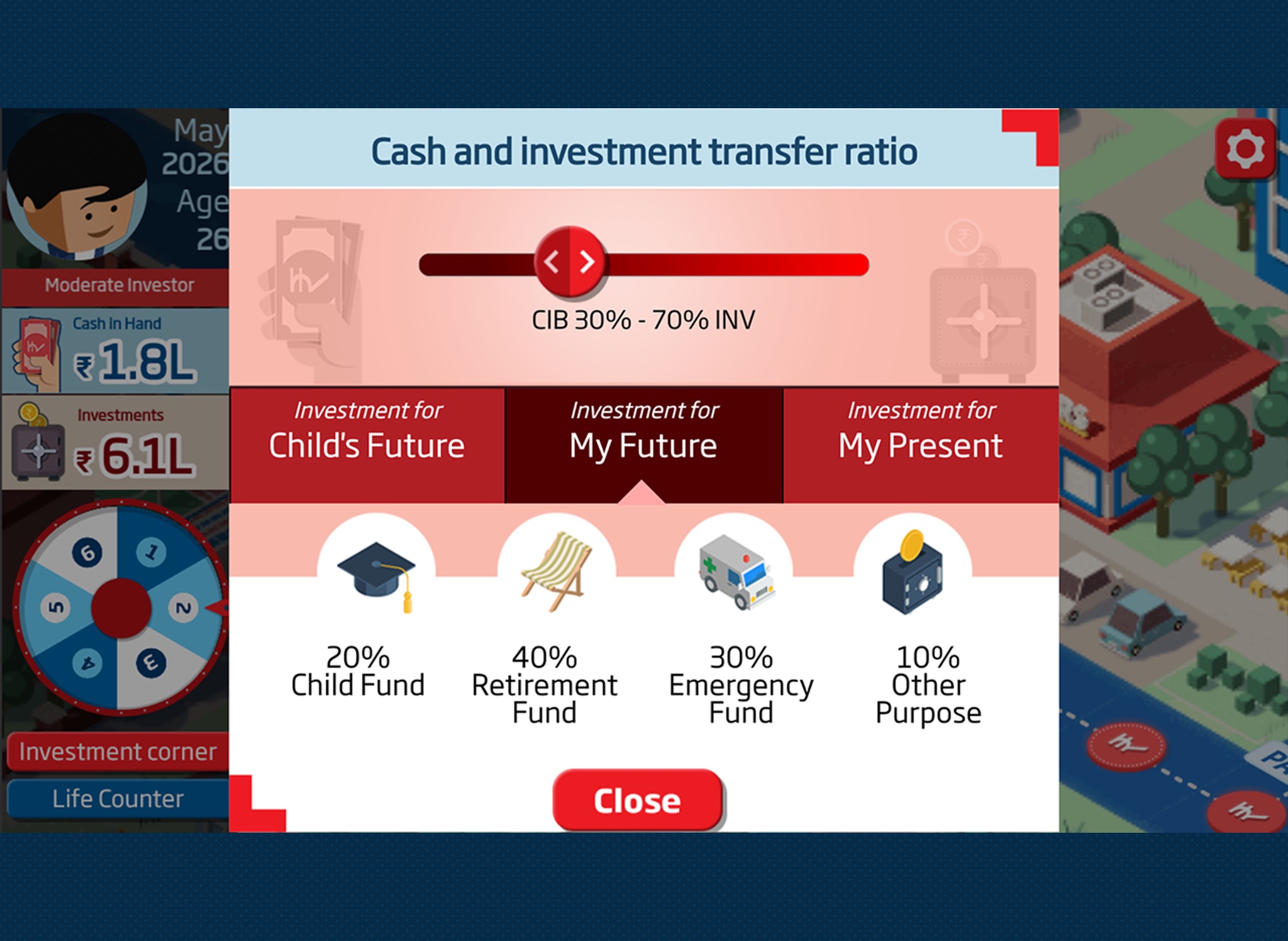 HDFC Life presents the Life Game – a single player real life simulation game! The goal of this game is to cover your risks, fulfil responsibilities and retire with a large corpus, while living a life of pride. As an individual, you will be earning a steady income and life events will come your way, having large and small monetary implications.