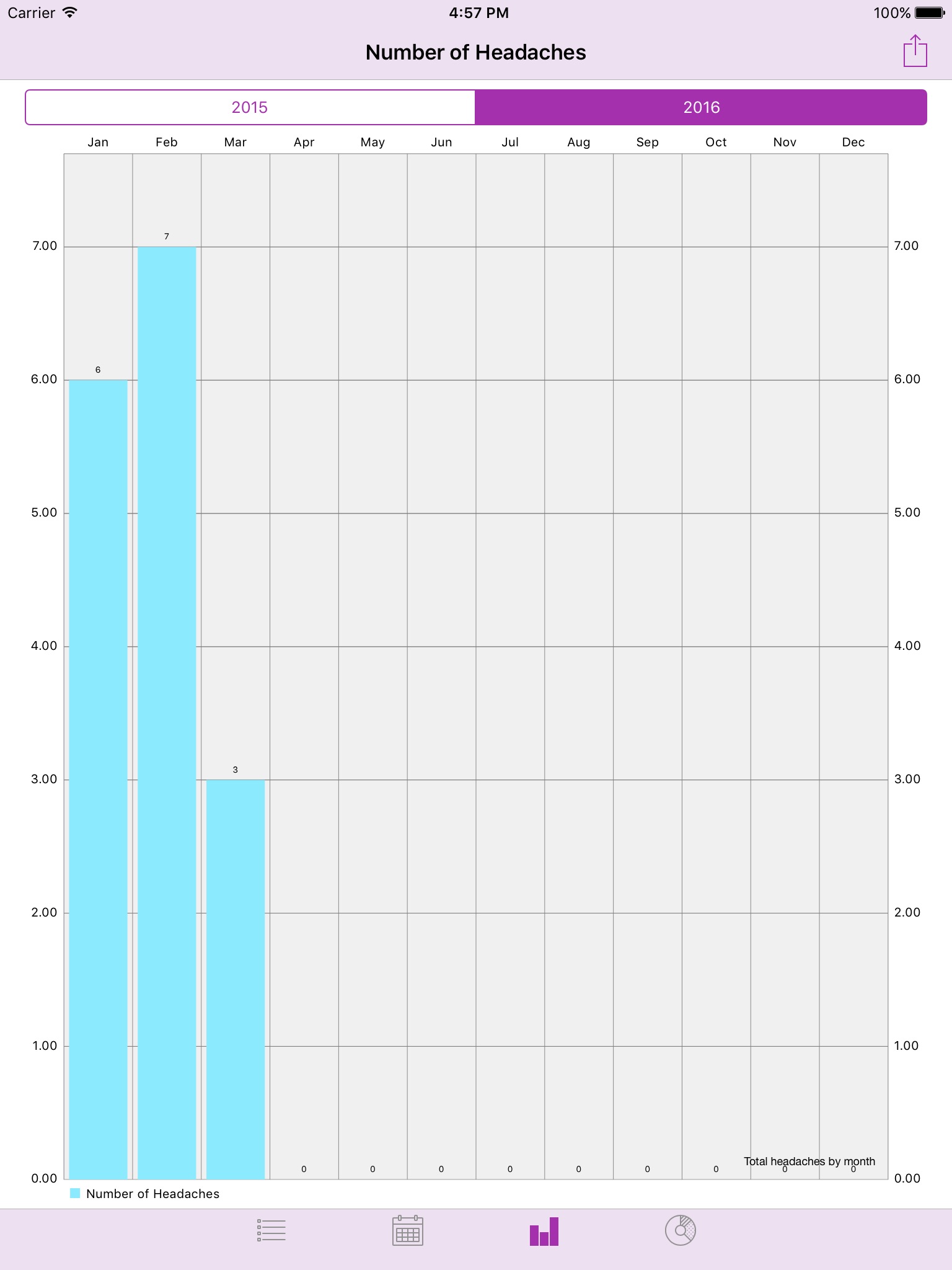 Easily track your headaches and view trends. You can assign a severity level to each headache and view all your headaches on a calendar, as a bar chart, and in a pie chart. You can also track any medications you took for a headache. Simple, beautiful interface, with no ads, no sign-ups, or in-app purchases.